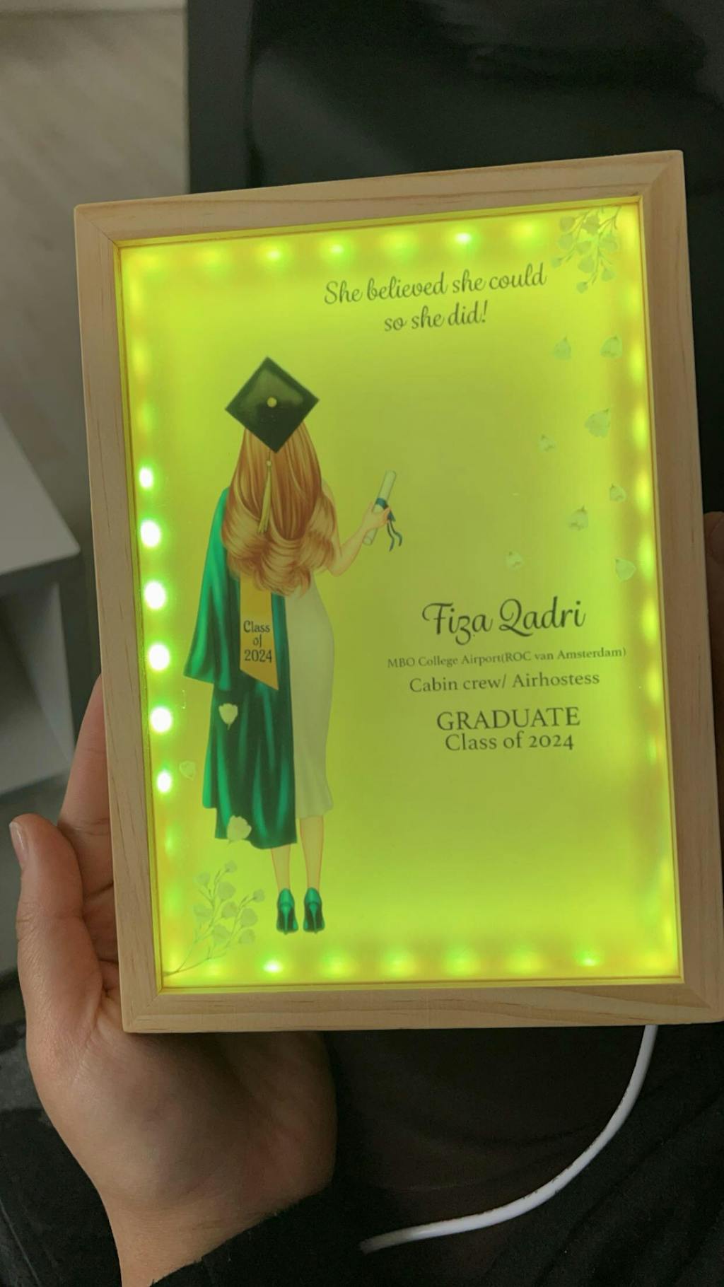 My niece received it just a couple of days ago and she loves it. She sent me a picture of it and it looks exactly like it does in the picture. She was so excited that the colors matched what she was wearing the day she graduated and I told her it was because I was able to customize it and she loved that fact. She said it looks really pretty lit up also.