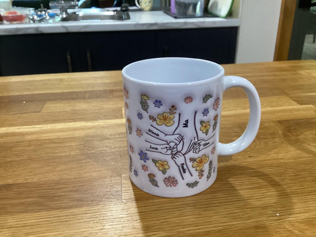 I received my coffee mug in good time but am disappointed that on one side at the bottom the name is blurred