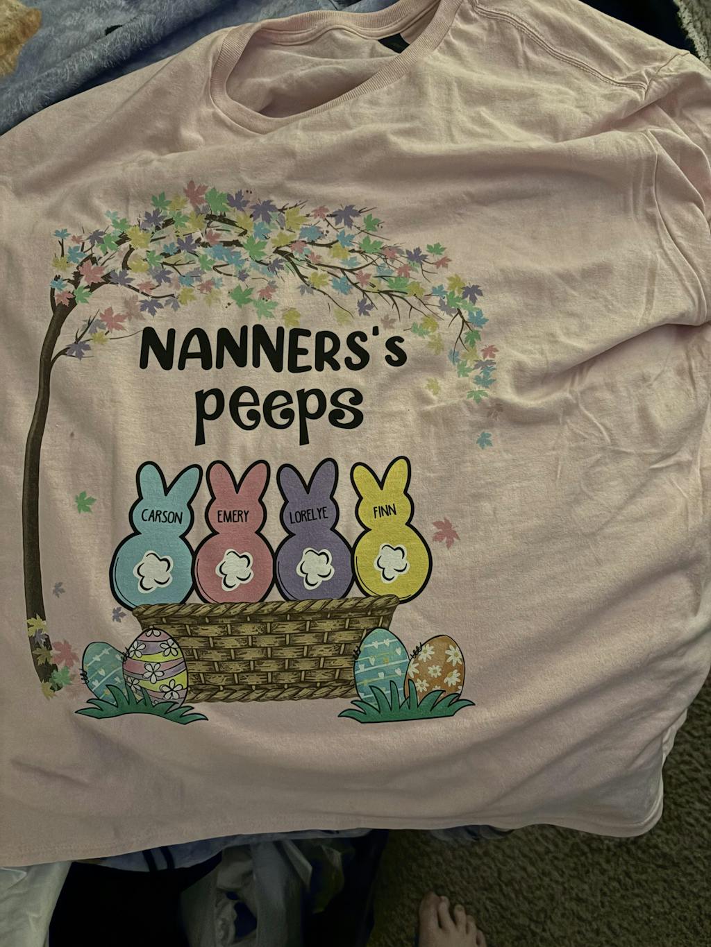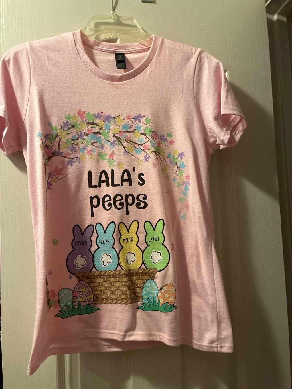 I LOVE my Lala’s peeps (small) woman’s shirt. Fits perfectly!!!! Quick and prompt order turn around! Beautiful pink color with colorful designs. I can’t wait until Easter!!!!