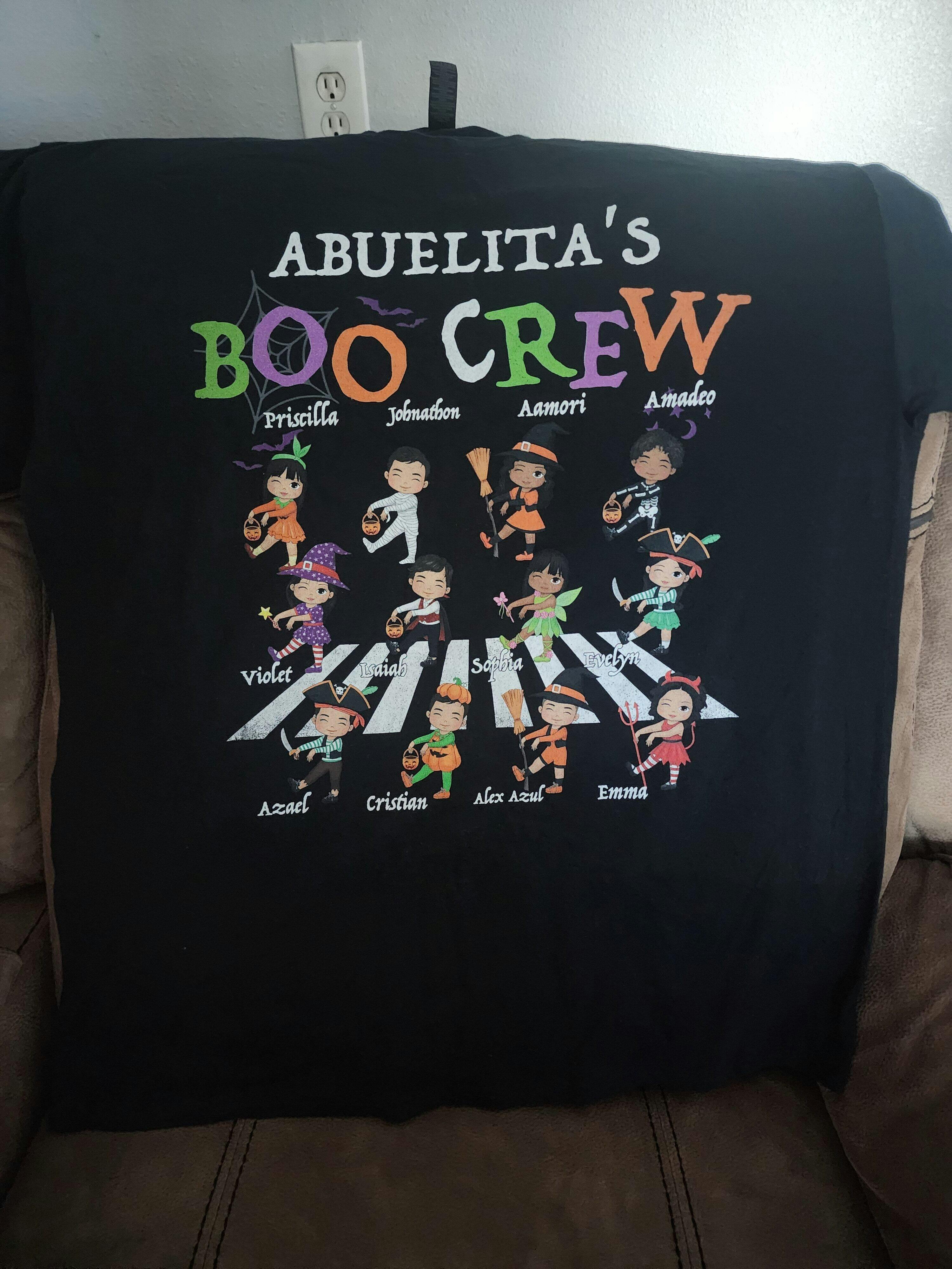 Love my shirt and my kids loved it as well. All my 12 grand kids are on it. Love the little costumes. I'm so excited, can't wait to wear it on Halloween and after that. Very happy with my purchase. Thank you it looks awesome
